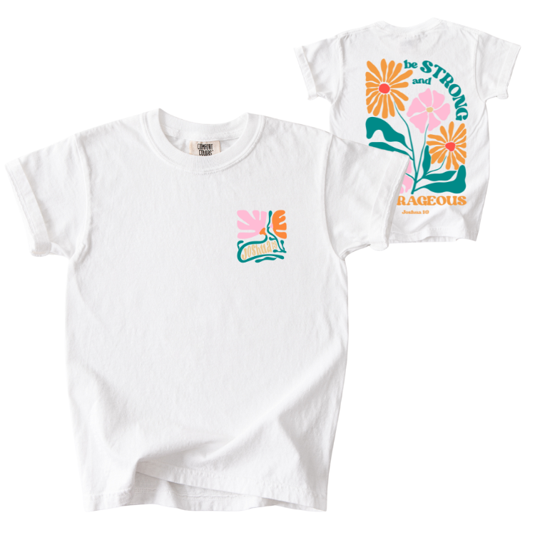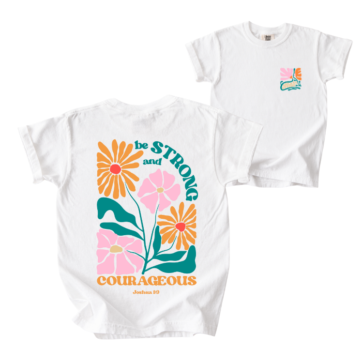 Back design: Retro flowers + “Be Strong and Courageous” (Joshua 1:9)