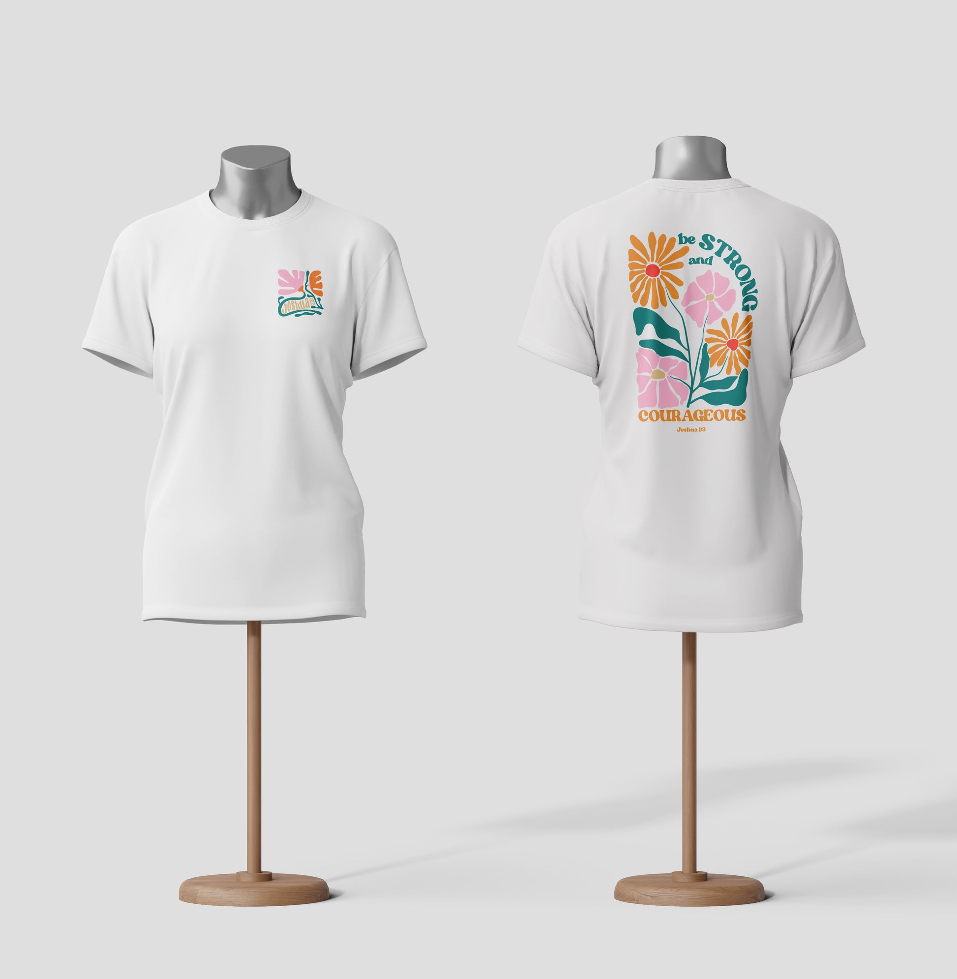 Back design: Retro flowers + “Be Strong and Courageous” (Joshua 1:9)