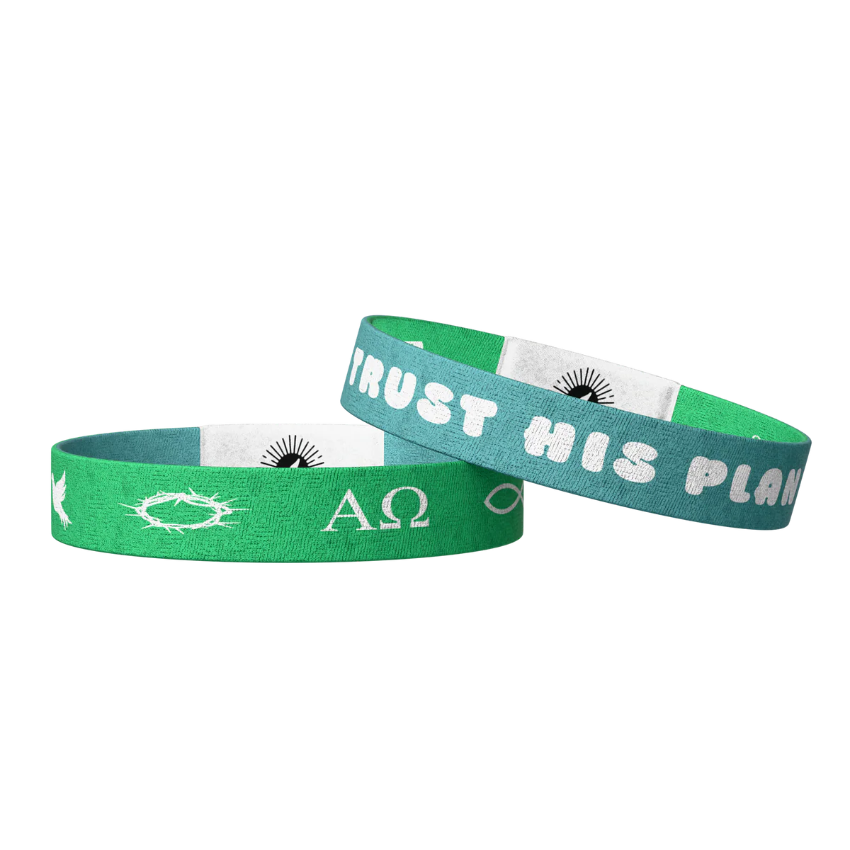 One side says “Trust His Plan” in bold white letters on a calming teal backdrop. The other side is filled with Christian symbols like the dove, crown of thorns, Alpha and Omega, and the fish, pointing to God’s promises and faithfulness through every season. With just a tap, a verse appears on your phone, encouragement for the exact moment you need it.